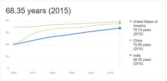 Average lifespan has been increasing in India by approximately 5 years per decade and it stands at 68.35 in 2015 (China is at 76 years and US is at 79 years). This is an average number and it is not uncommon to see people living beyond 90.